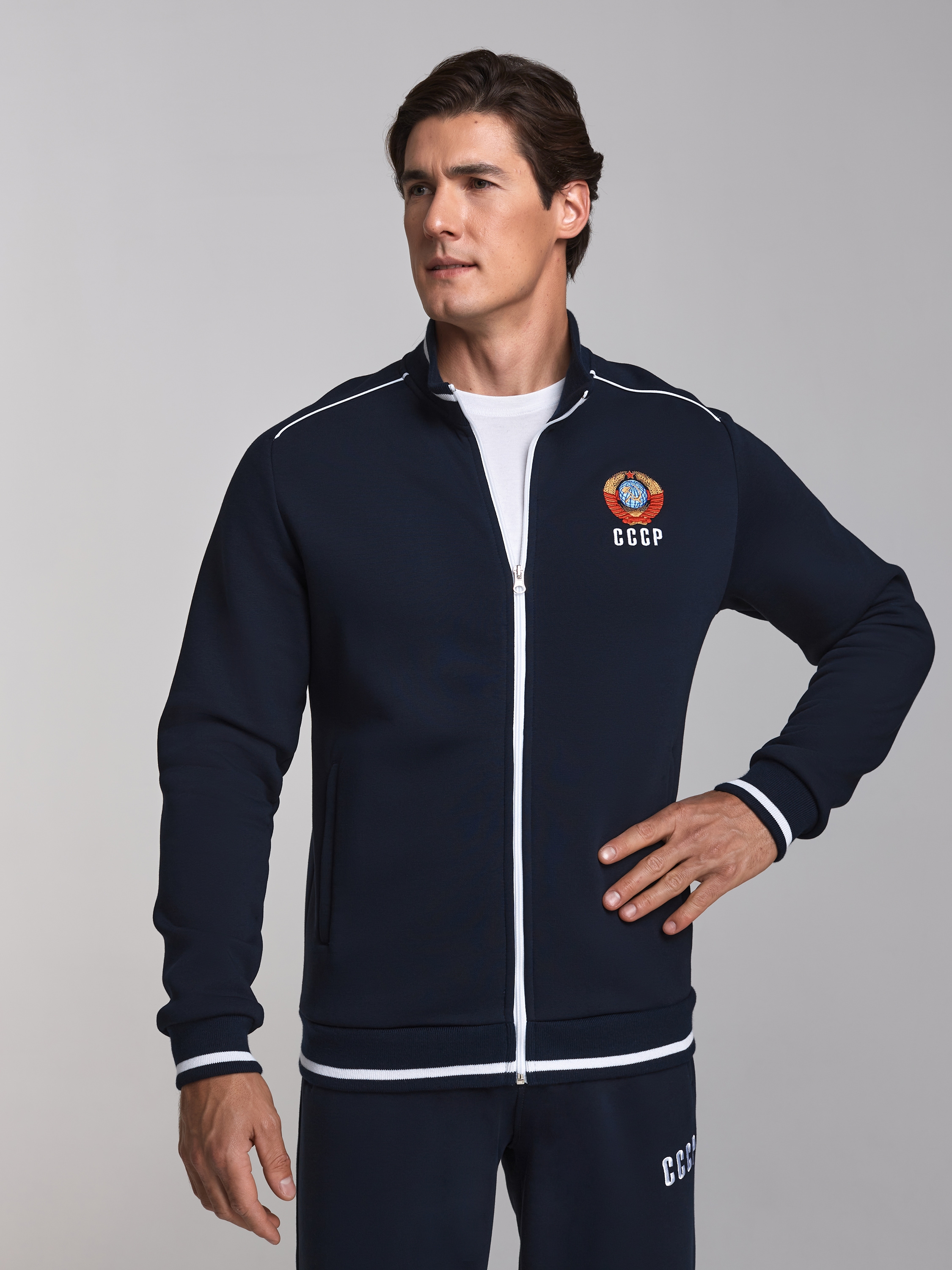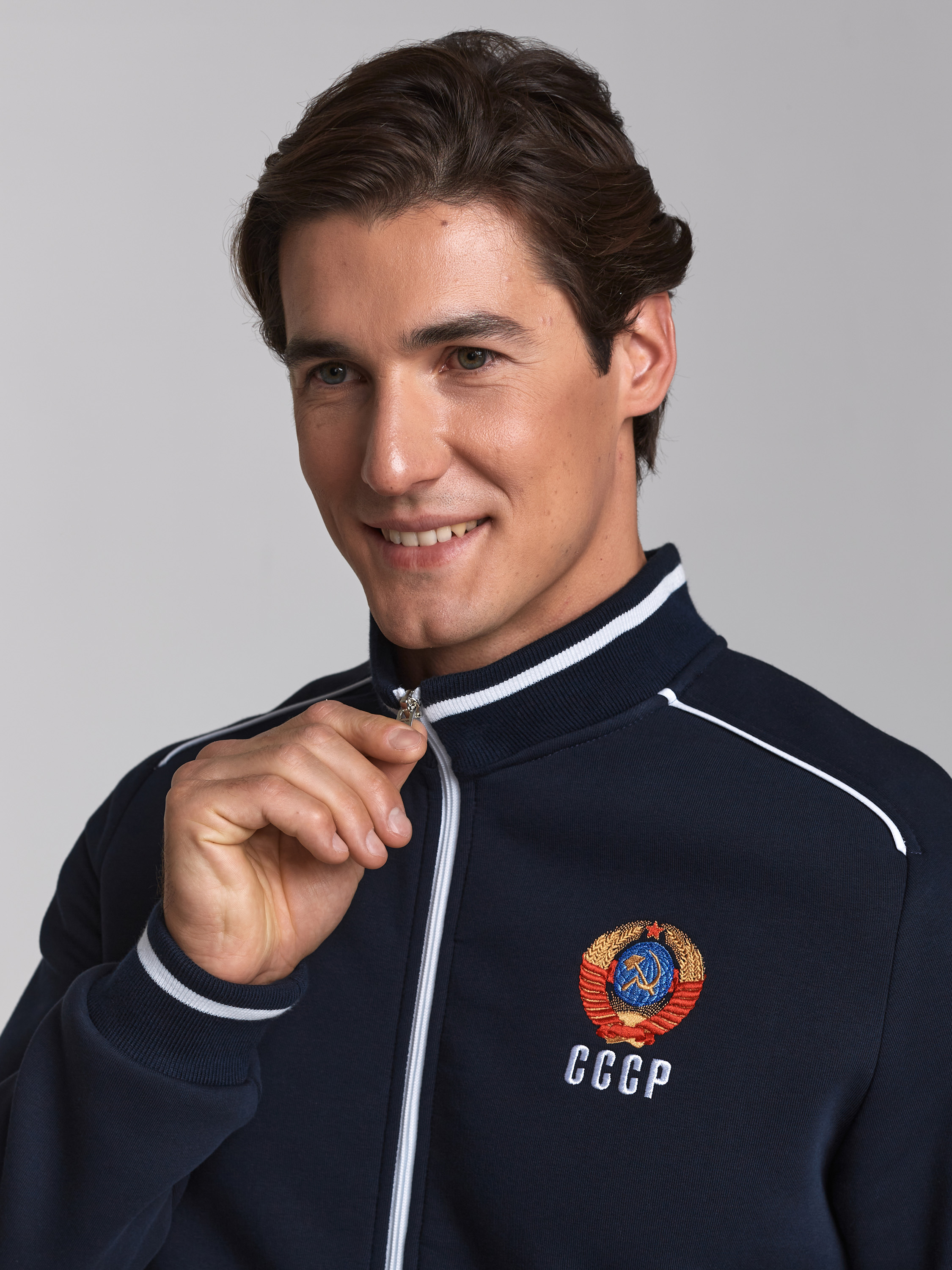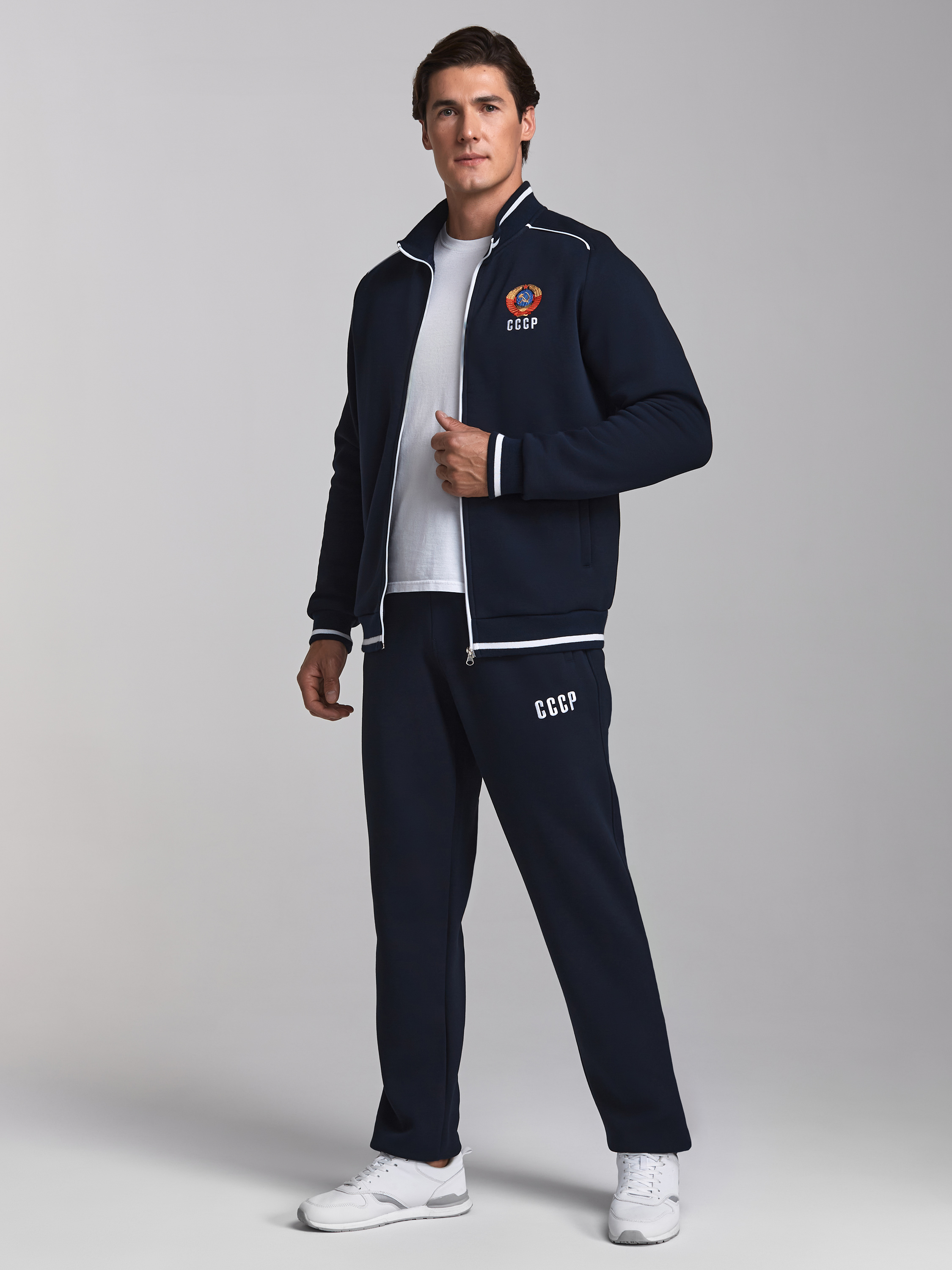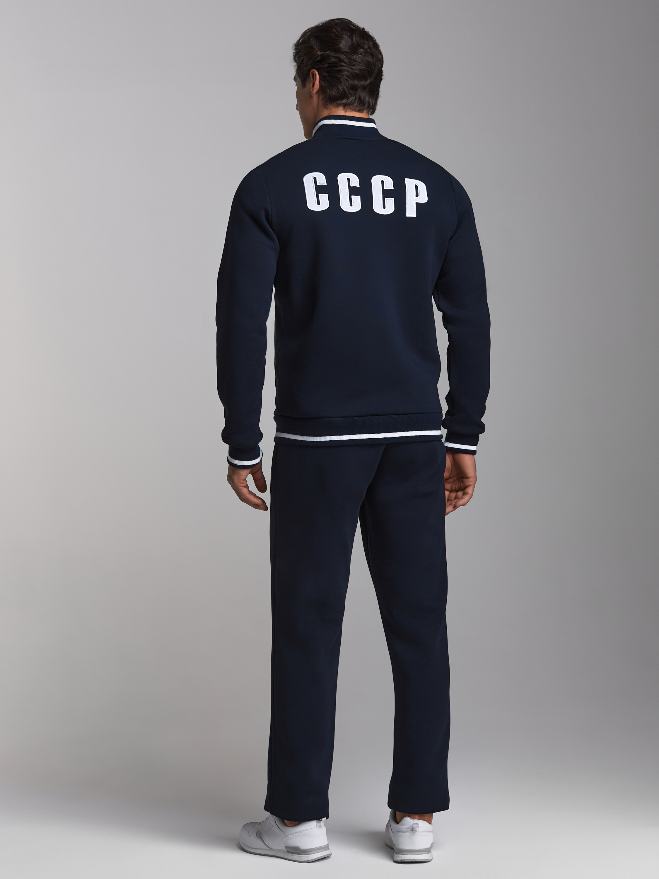 Спортивный костюм мужской, из хлопкового плотного трикотажа с начесом по изнанке. Куртка свободного покроя, на поясе, с воротником, застегивается на молнию. Рукава покроя реглан, в плечевой шов реглана спереди вставлен белый кант. Прорезнные карманы куртки и брюк застегиваются на молнии. Слева на груди вышивка герба СССР. На спине белая вышивка-аппликация СССР. С левой стороны на брюках вышивка СССР белыми нитями. Пояс куртки, манжеты и воротник выполнены из подвяза с белой полосой. Брюки прямые. Пояс брюк по линии талии с эластичной тесьмой дополнительно регулируется шнуром.