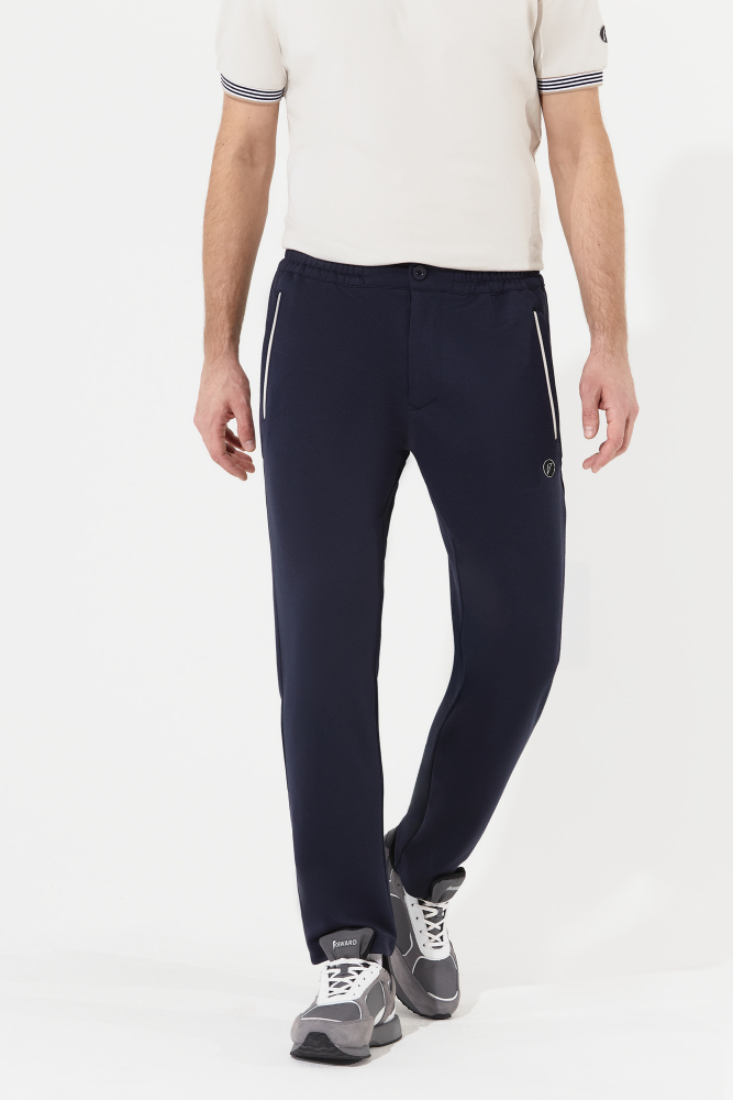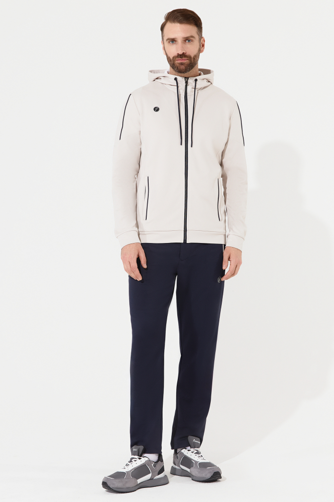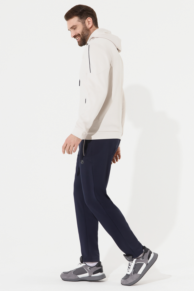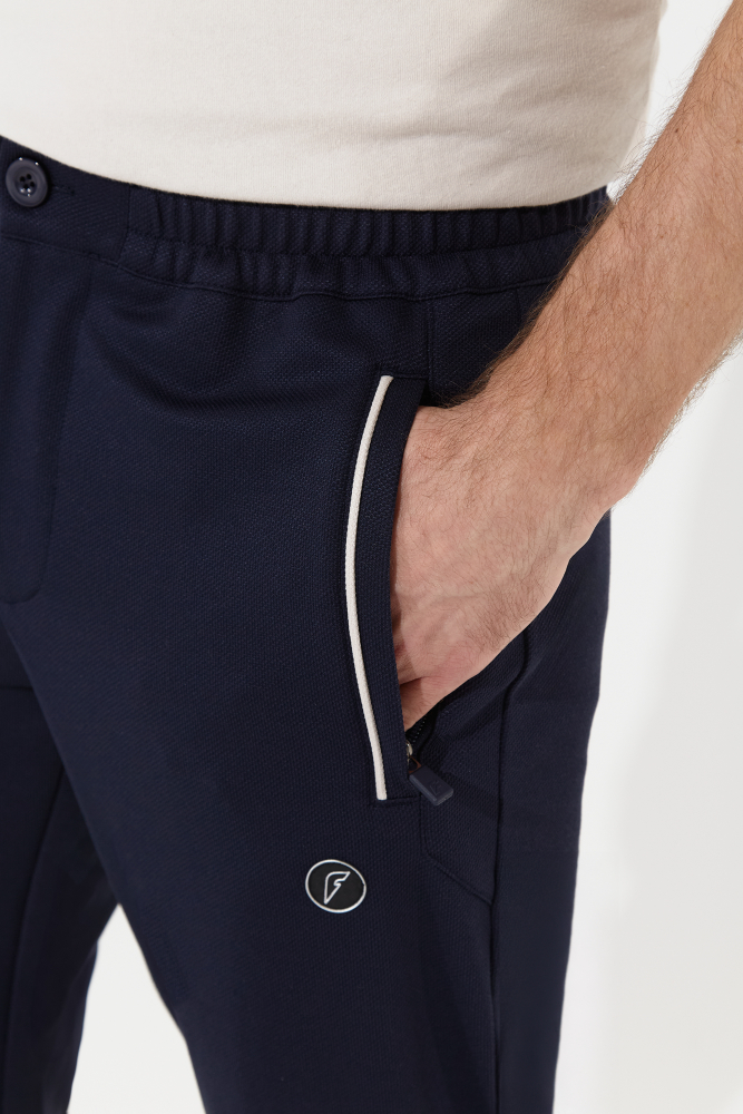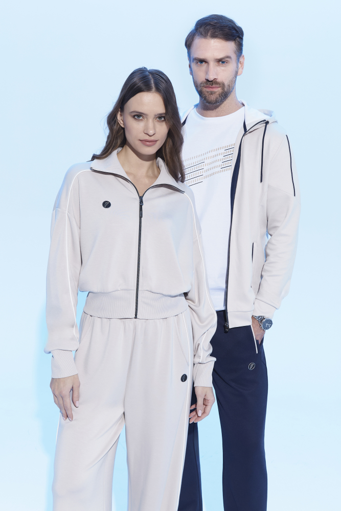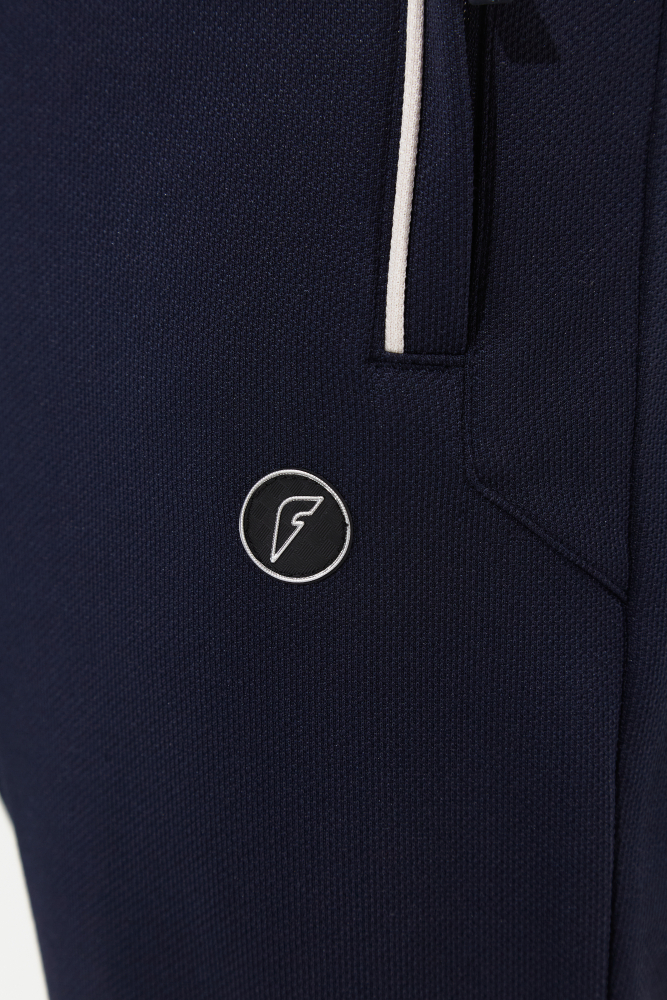 Брюки зауженного силуэта дополняют образ: боковые карманы на молнии с кантом, пояс на эластичной тесьме со шнурком и аккуратный низ брюк в подгибку с открытым срезом. Принт «F» на брюках завершает спортивный образ.