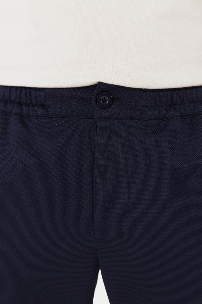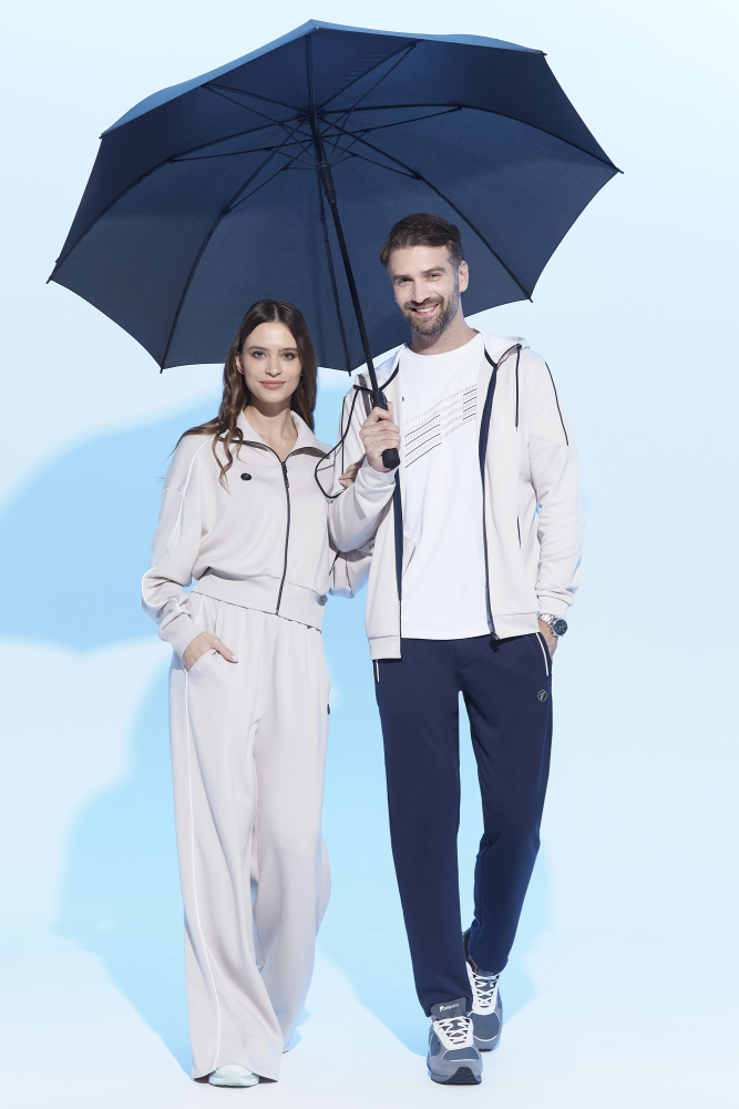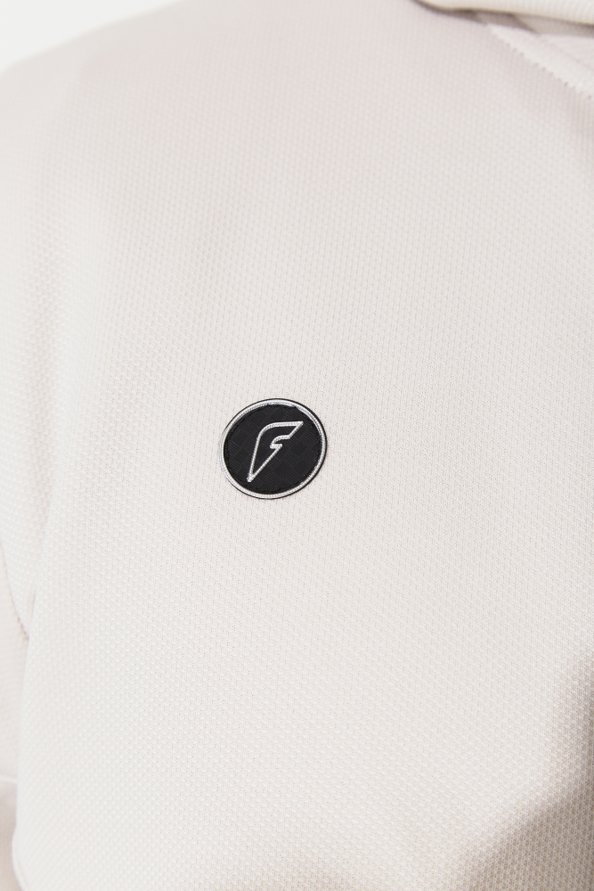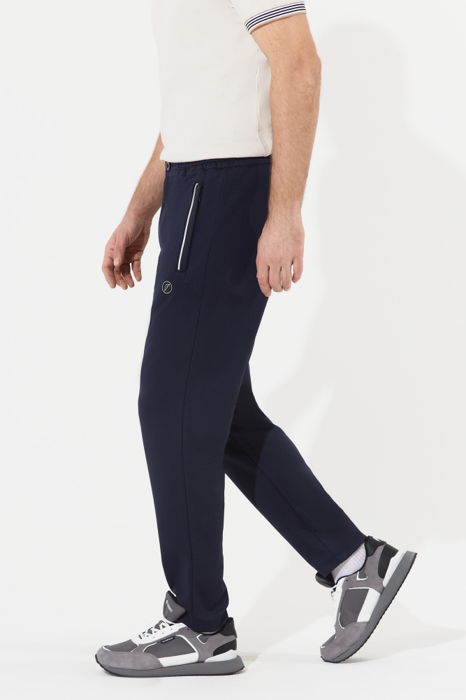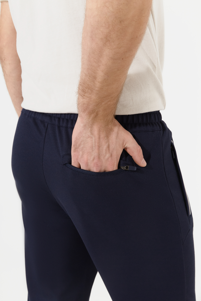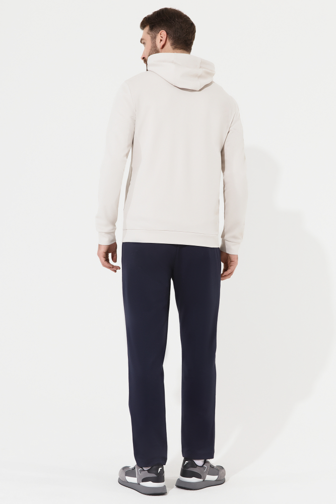 Брюки зауженного силуэта дополняют образ: боковые карманы на молнии с кантом, пояс на эластичной тесьме со шнурком и аккуратный низ брюк в подгибку с открытым срезом. Принт «F» на брюках завершает спортивный образ.