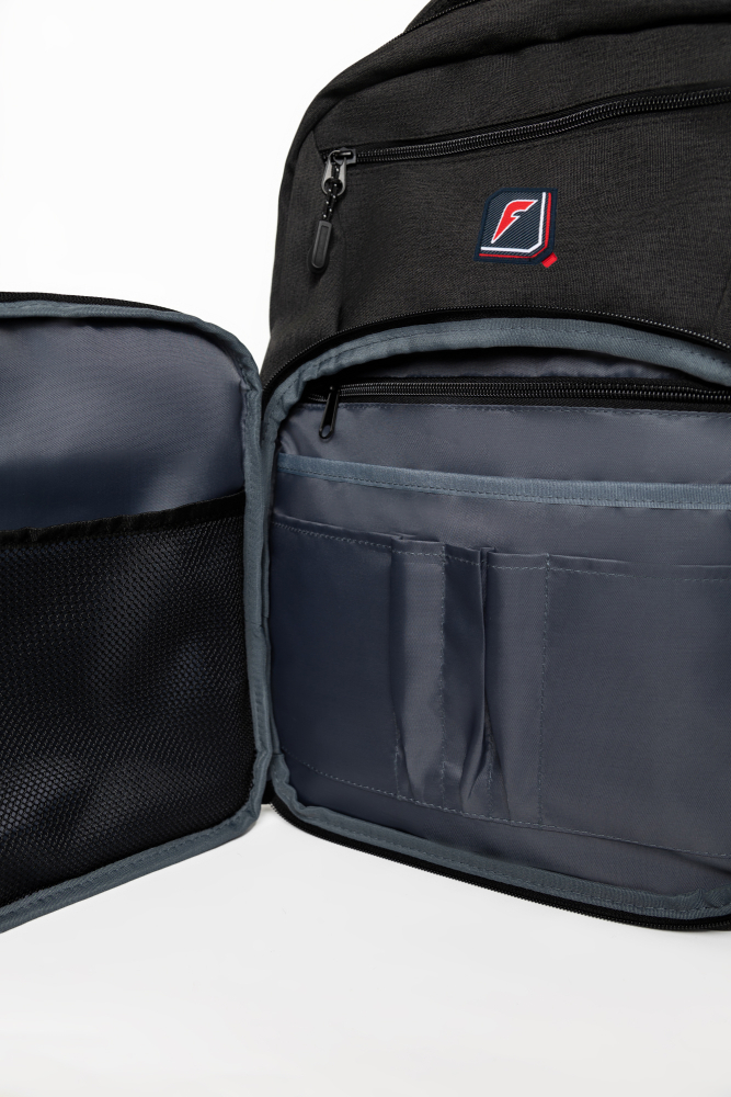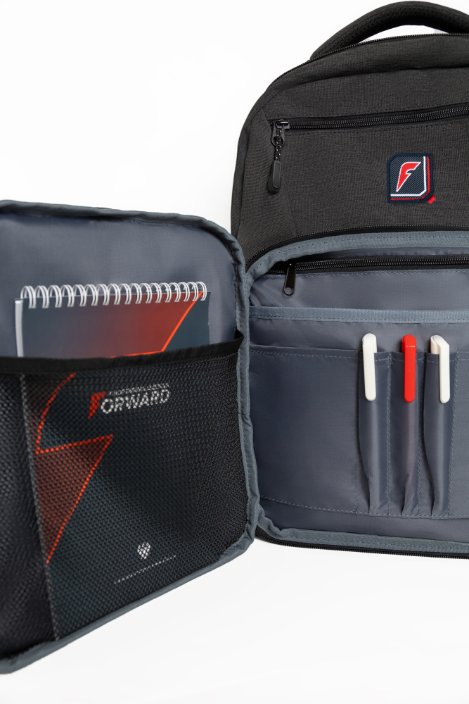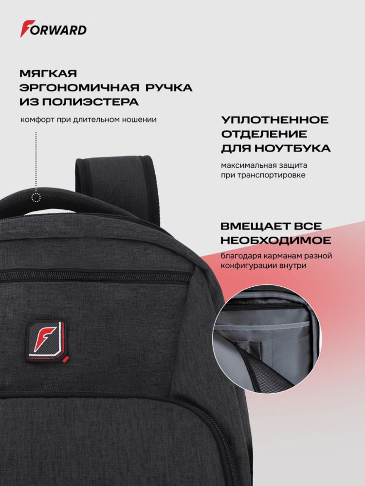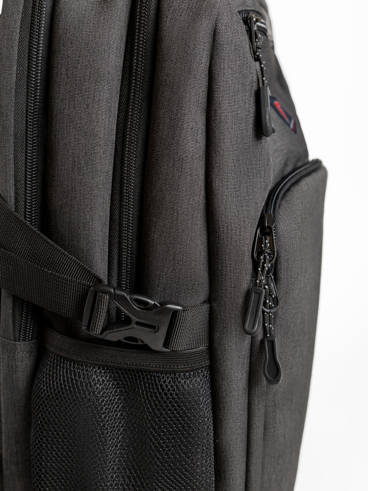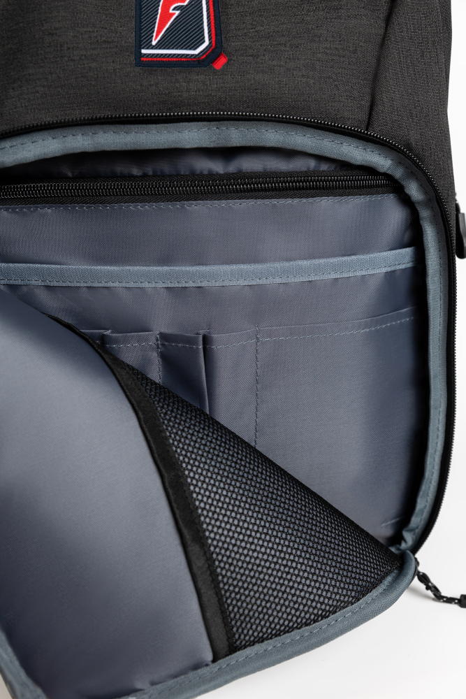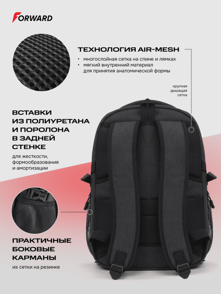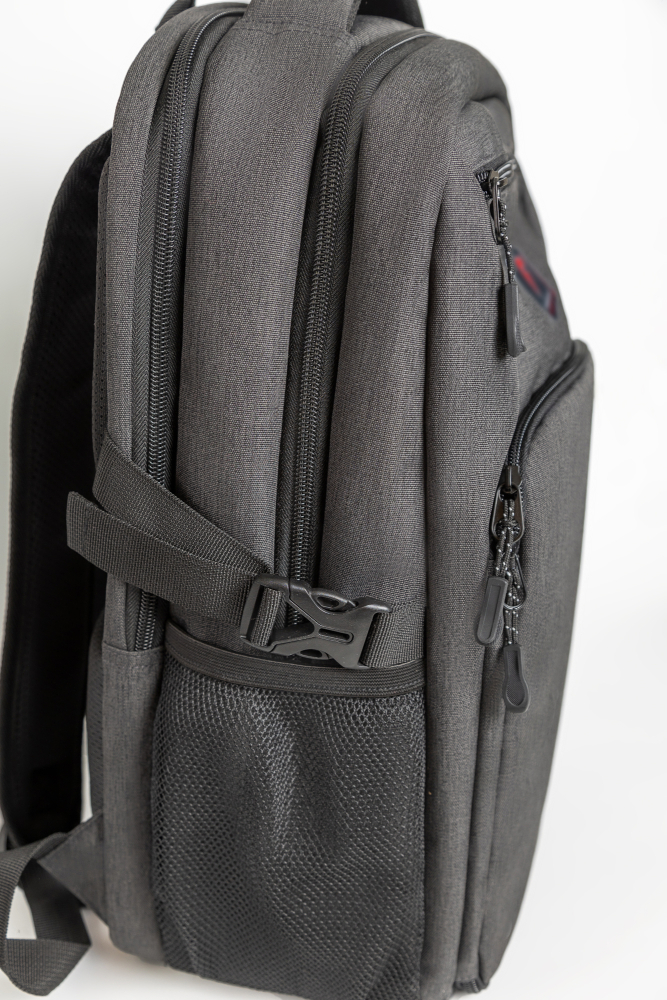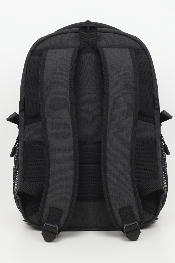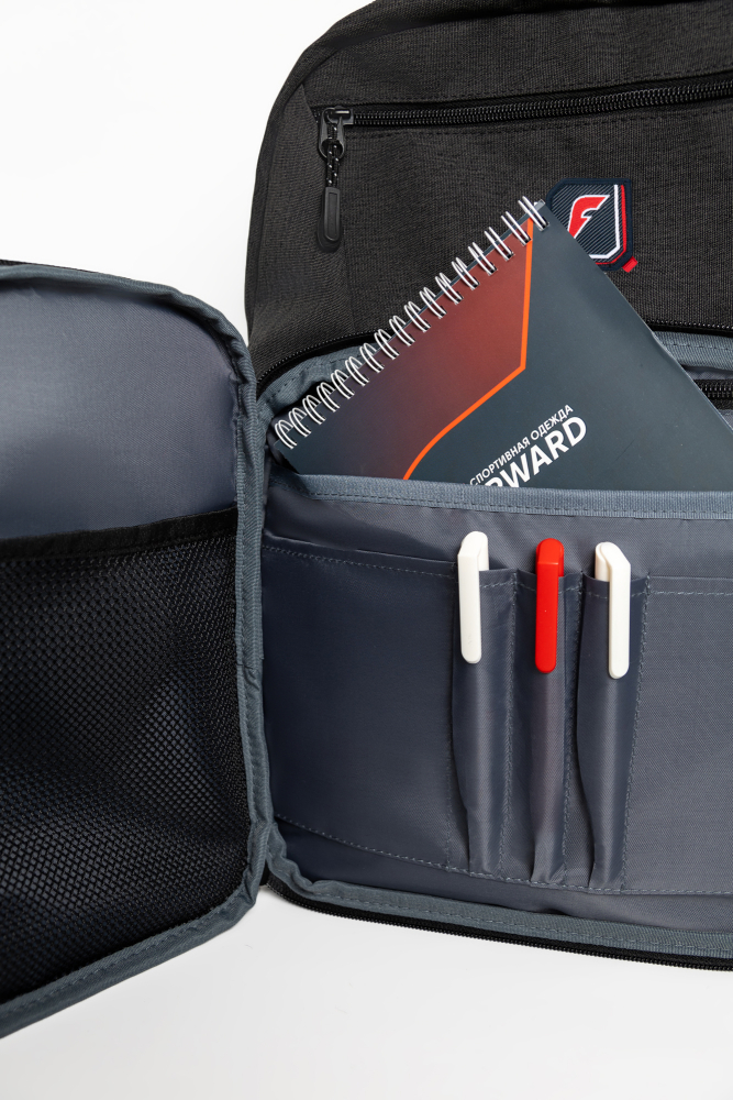 По бокам рюкзака расположены накладные карманы из сетки. Внутри выполнен карман для ноутбука.