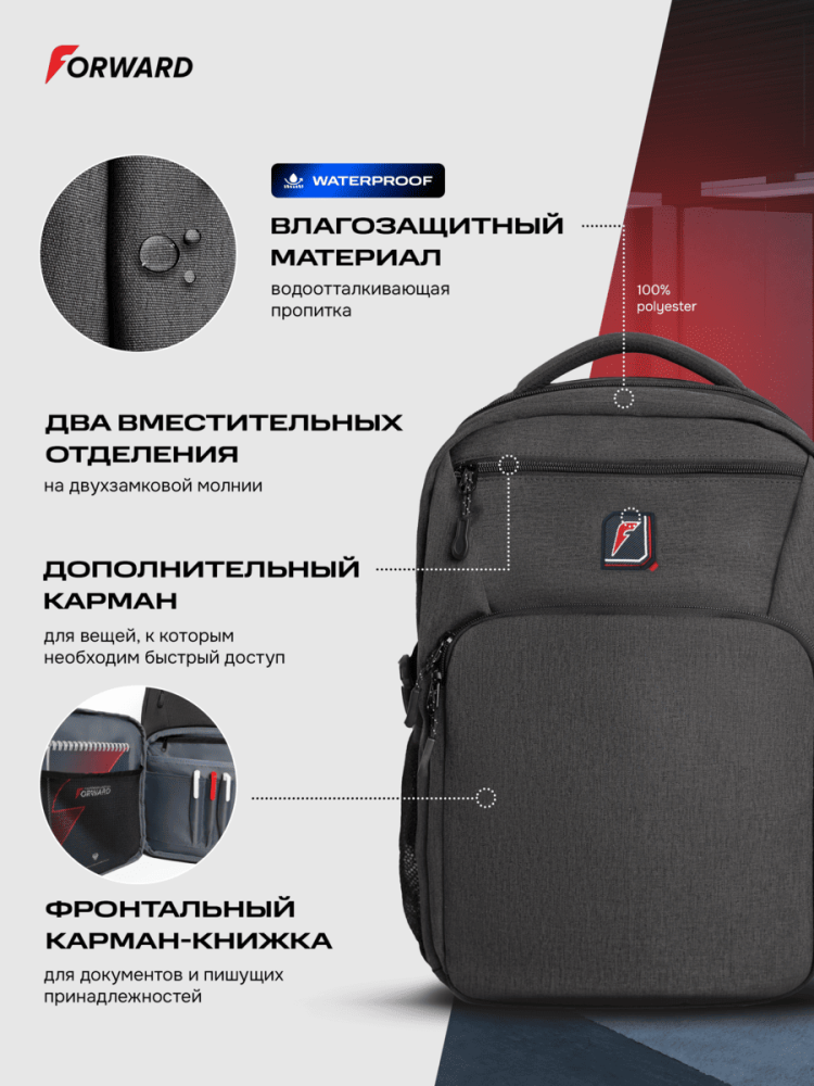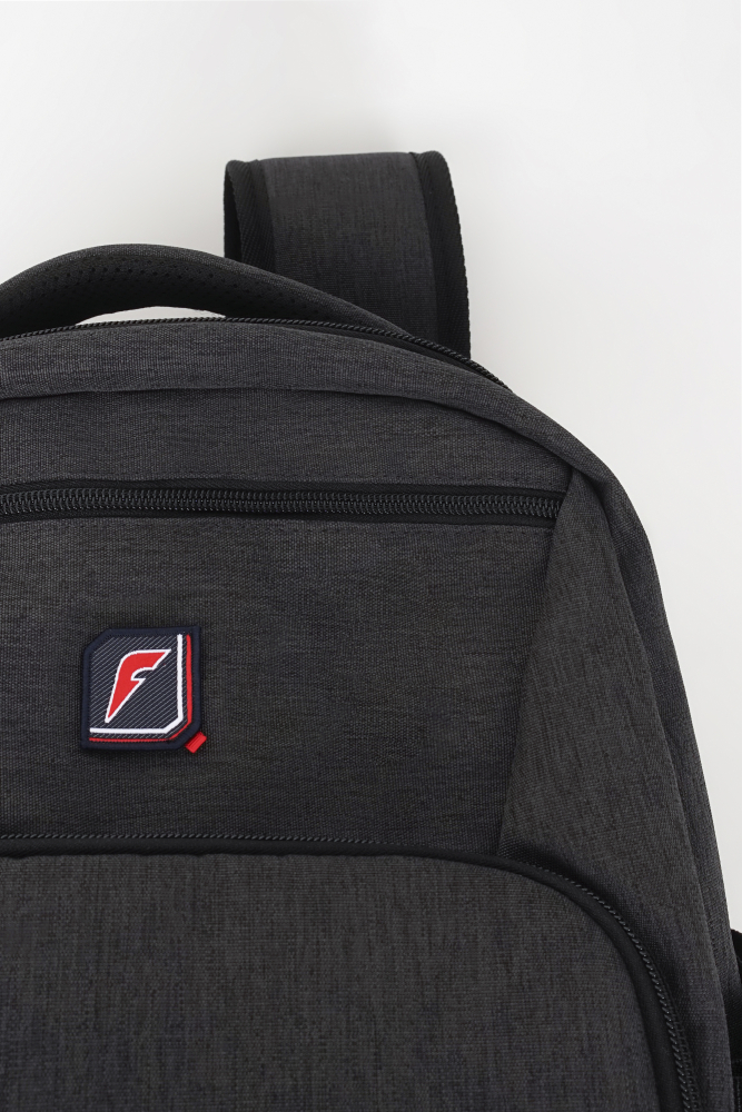 На передней части рюкзака выполнены карманы с двухзамковой тесьмой молнией.