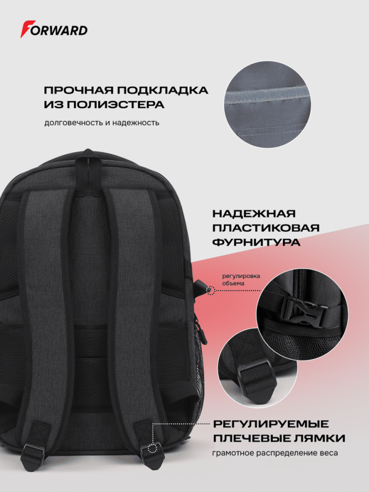 Спинка и лямки продублированы мягким материалом. Для регулировки длинны лямок предусмотрены пластиковые пряжки. Так же предусмотрена пряжка для фиксации лямок на груди.