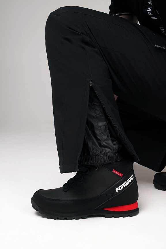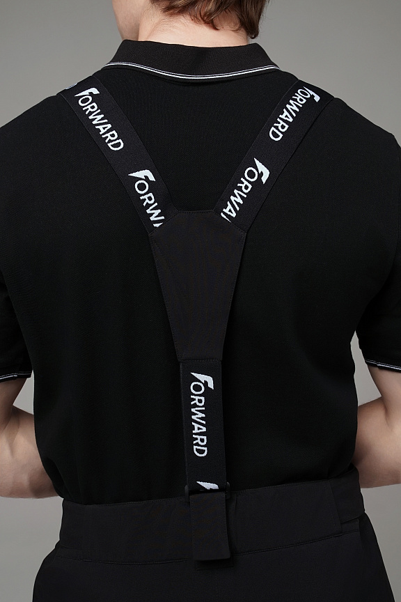 Брюки прямого силуэта, с отстегивающимися и регулируеющимися бретелями. Брюки с боковыми карманами на тесьме молния. По низу брюк выполнены снегозащитные манжеты.